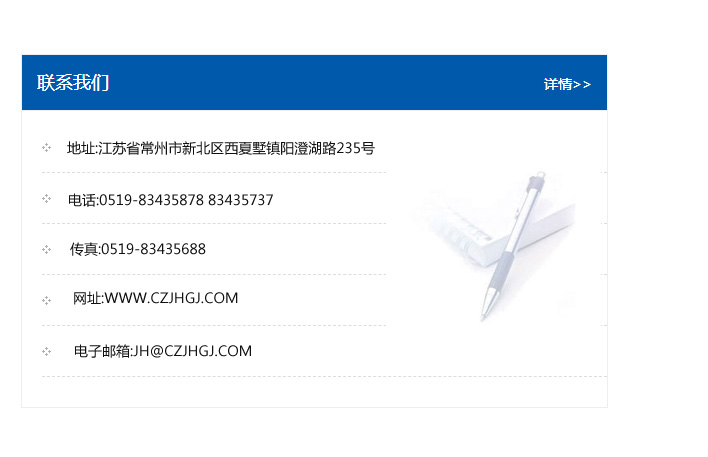 地址:常州市新北區友邦商務大廈1幢16、17層  電話:0519-85101652  傳真:0519-85112595  郵編:213022  網址:www.cz-jiayue_cn.meibukeyan.com  郵箱:xiajifengaa@163.com